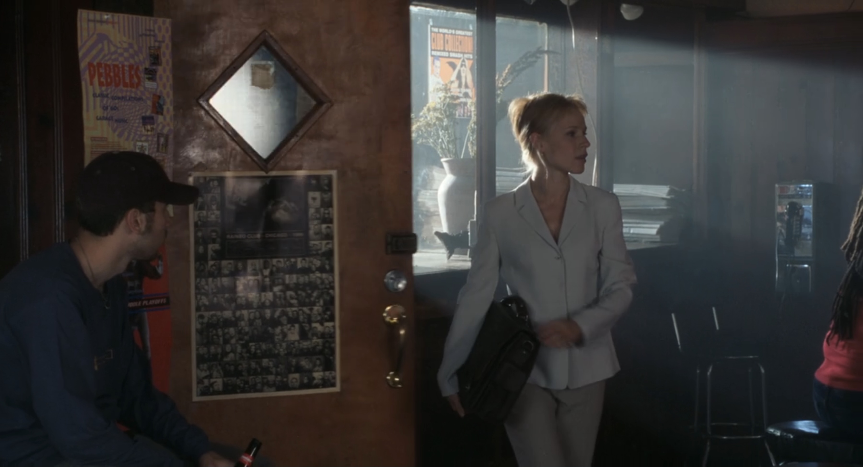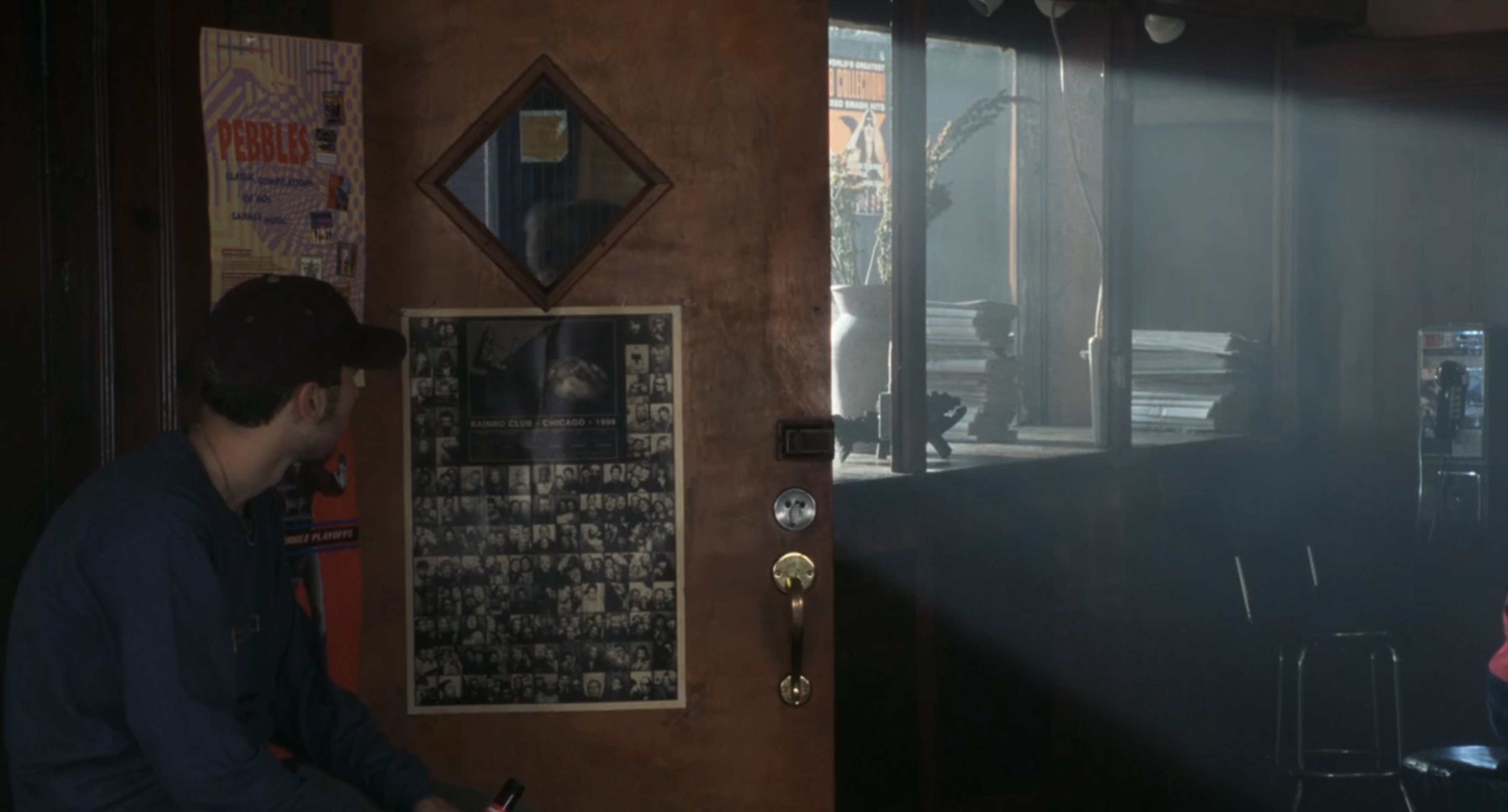 John Cusack plays Rob, a neurotic record-store owner who revisits his past relationships to figure out why they failed. The movie is shot in Chicago and features many iconic Chicago locations. Near the end of the film (1:39:58 mark), Rob meets ex-girlfriend Laura (Iben Hjejle) at Rainbo Club to propose to her. While you don't see the photobooth that is housed there, you do catch a quick glimpse of the annual poster the venue creates from photos taken in their booth. It's hard to tell whether the poster shown is from 1989 or 1999.