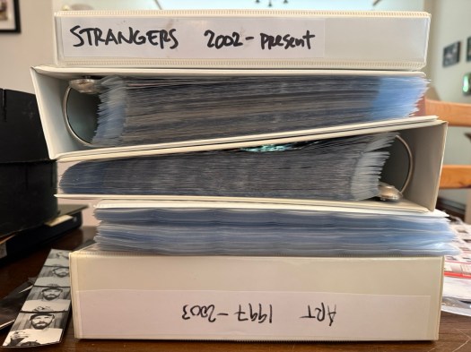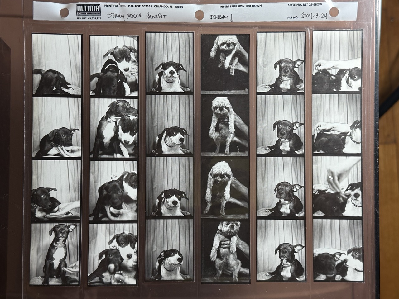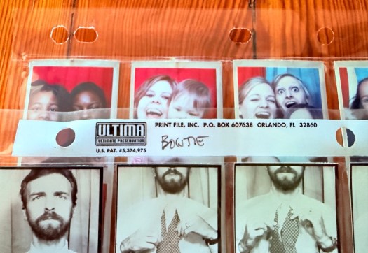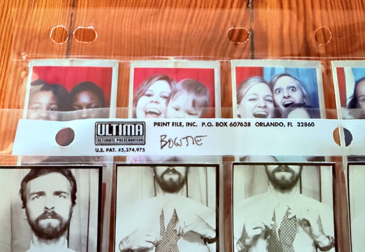 After failed attempts at using photo corners (too labor-intensive), philatelic mounts (too fussy), and various bags, envelopes, boxes, and hanging-file systems, I began testing the archival storage offerings at Print File. Print File has a wide selection of notebooks, pages, sleeves, and boxes for storing photos and negatives. I tried a few different sizes of sleeves, and settled on the ULT 35–6BXW Negative Pages. These are pages designed for 35mm negatives that are already in plastic sleeves, and it turns out they fit a standard 4‑pose photostrip like a glove. They also have a small welded seam at the bottom of each photo channel so the strip can’t slide out the bottom of the page. The pages are slightly longer than a strip, so you end up with some unused space in each slot, but it was a better option than the slightly-too-small ULT 35–6HB pages. I also tried similar pages from other manufacturers (Pro-Line #PL24920, ClearFile #12011B) but felt like the Print File pages were of higher quality.