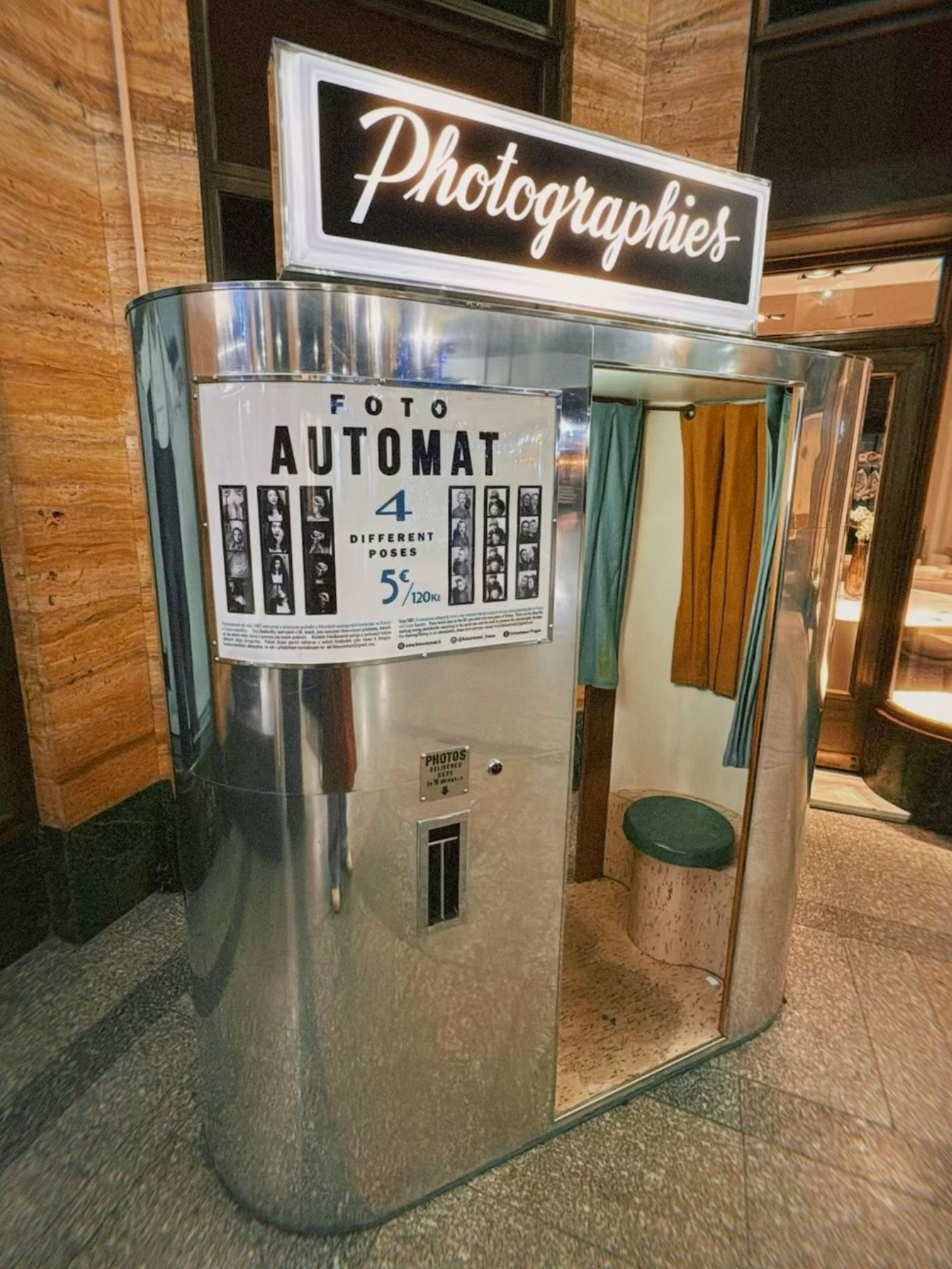 Thanks to Michelle for letting us know about this Fotoautomat machine located at the Art Nouveau Gallery U Nováků in Prague. According to the Fotoautomat website, the machine is a "complete reconstruction of a Model 9 from the 1950s." Contributed by Michelle | |